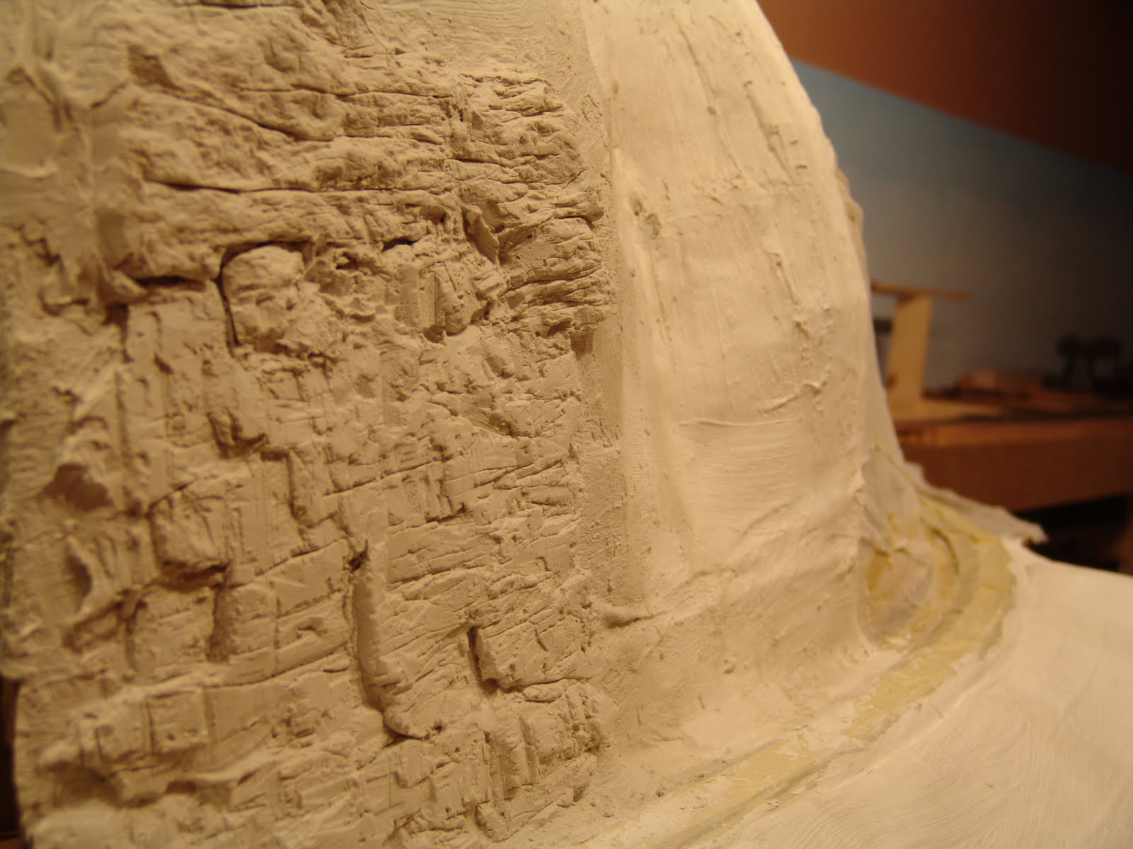 some irregularity in the stone. The challenge is to avoid repetition. Only one cup of plaster can be worked at a time so the process was repeated many times working from the top to the bottom of the cliff until the cliff was all carved. The close-up picture shows the detail of this carved limestone rock. This sculpture process required 8 or 9 hours to complete.