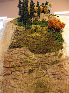 The picture at the left shows the entire mountain with all of the rest of the rock carved and in place. The upper rock was carved to resemble a different type of rock. The rock behind each of the steps that support the trestle was carved to resemble rock that had been blasted away to make a support for the trestle bents.