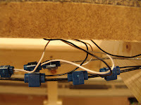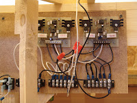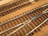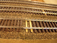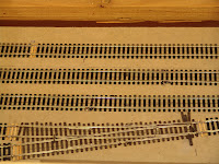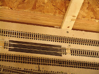 There is one other note of interest for those who wonder about the sanity of the owners in constructing the large trestle at Sulphur Gulch. The engineer constructed this trestle from a single piece of 1 x 4 clear pine. He ripped the board into 1/4 inch slices on a large table saw. He then ripped these pieces into scale sized lumber for the trestle using a small table saw with a very sharp carbide blade which had been pushed through the plate so there was no clearance between the blade and the plate. The bents were first drawn to exact size on a piece of poster board. The upright timbers where then placed over the drawing using double stick tape. The cross supports were then glued to the uprights with carpenter's glue and weighted. After all the bents had been constructed the trestle was assembled upside down. The trestle is on a grade and a curve. A piece of board was cut to the exact radius of the curve and one end was raised to represent the exact amount of the 3% grade. The track support beams and ties were then placed on this board using double stick tape. The uprights were then glued to the support beams using a level to get them vertical. The diagonal beams for each pair of bents were glued in place using contact cement. Then the cross support timbers were glued in place. The construction of the trestle was spread over about 6 months working an hour or two at a time.