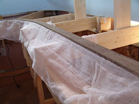 The next step was to form the mountain with cardboard strips held together with hot glue. Mother nature (aka Chairwoman of the Board and the artistic director for the ATSGRR) suggested that mountains should contain ridges, crevices, streams to feed the waterfall, and other scenic details. The actual forming of the mountain was modified a couple of times to comply with Mother Nature's tendency to provide interesting terrain and a stream to feed the waterfall falling into Sulphur Gulch. Once the basic shape was formed the cardboard lattice was covered with cheese cloth which was held in place by diluted white glue brushed on to hold the cloth in place (left).