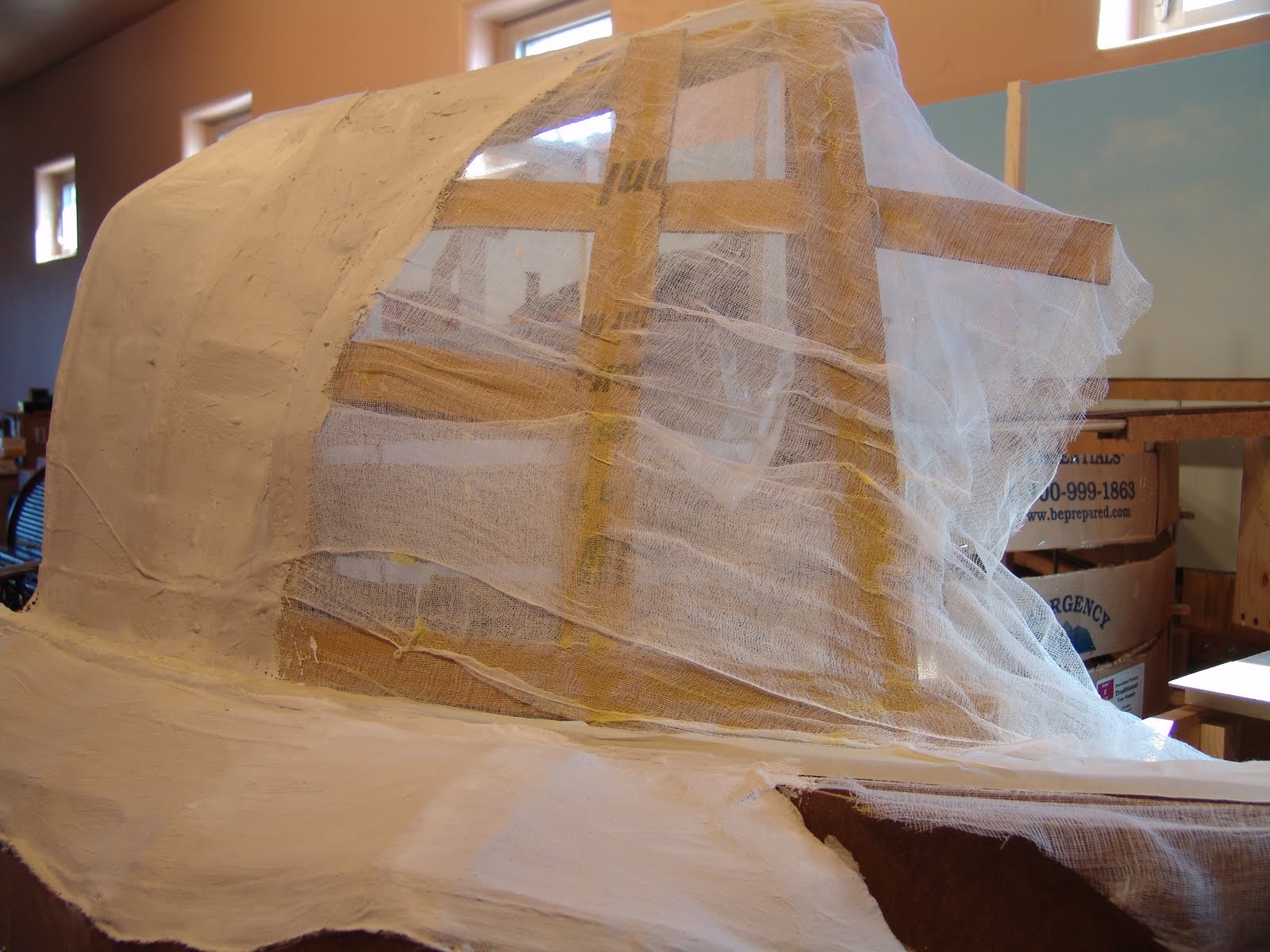 The next step was to brush a coat of plaster over the cheese cloth to form a thin plaster shell that provides the basic form of the mountain and canyon. The picture (right) was taken after a couple of plaster casts of rocks had been added to the top of the mountain.